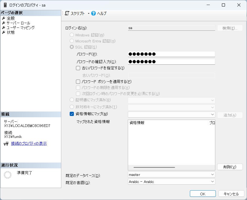 3.「セキュリティ」「ログイン」右クリック「新しいログイン」でユーザーを作成する。