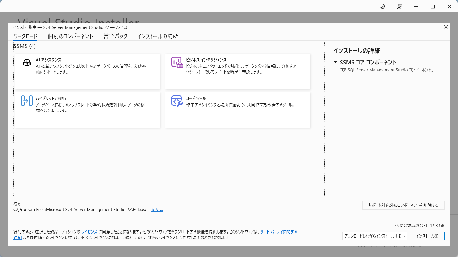 1.ダウンロードしたファイル(vs_SSMS.exe)を実行しインストールをする。